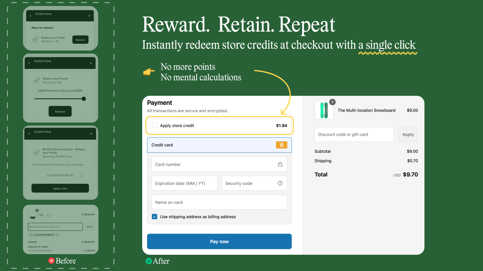 Reward customers with store credit on every purchase! No more points, instant money in wallet.
