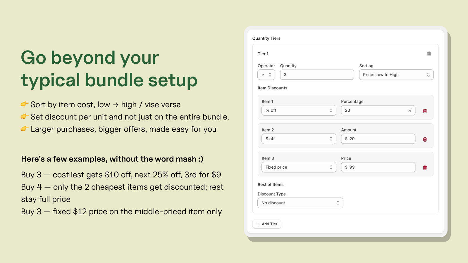 Create advanced bundle discounts with quantity tiers, dynamic sorting, and flexible reward rules.