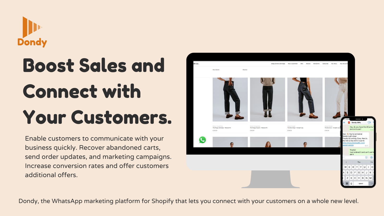 Elevate your marketing strategy using WhatsApp with Dondy. Recover abandoned carts and send revenue-driving messages, including exclusive offers, reminders, and personalized automated messages via WhatsApp. Also, make use of our WhatsApp chat widget for instant and effective customer service. Effortlessly maximize conversions and grow your business.