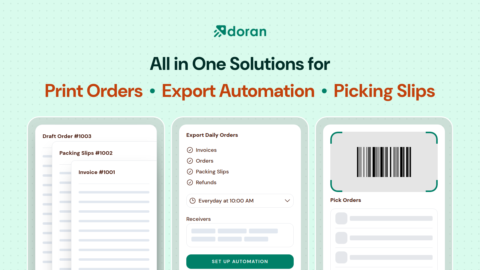 Doran: Order Printer & Pick simplifies order management by enabling merchants to batch process orders for printing and exporting. Perfect for merchants with large order volumes, this app allows you to print multiple documents in a single click, automate daily order exports to email, and create beautiful, customizable templates. Supporting multiple languages, it’s ideal for global sellers. You can also streamline your fulfillment with easier order picking, compatible with scanners.