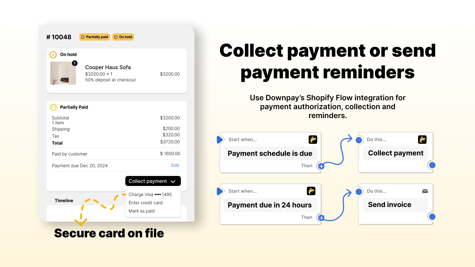 Customers want to buy your high value made to order preorder products but may need payment flexibility. Offering partial payment, deposit, or pay later options on products with build times can improve sales and customer loyalty. Enable payment reminders or simply collect the remaining balance from the card on file when you're ready to ship. Downpay supports Shopify features like discounts, Flow, bulk editing, and themes including Hydrogen. Elevate your buyer journey with Downpay for deposits.