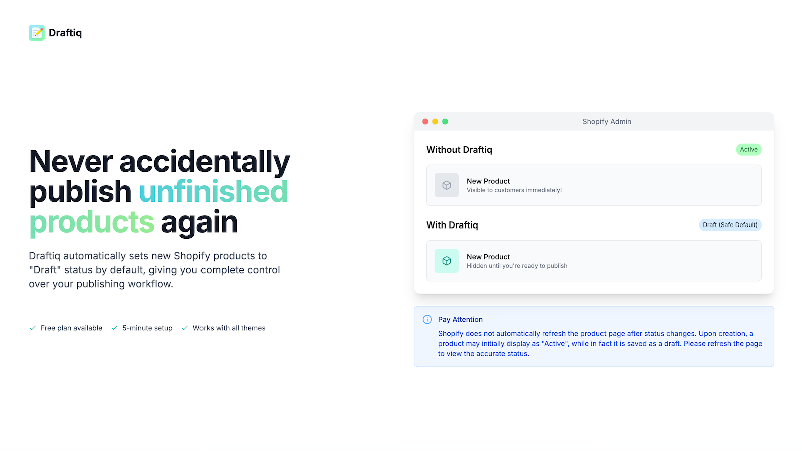 Automatically save new products as drafts and stay in control of what goes live — with Draftiq.