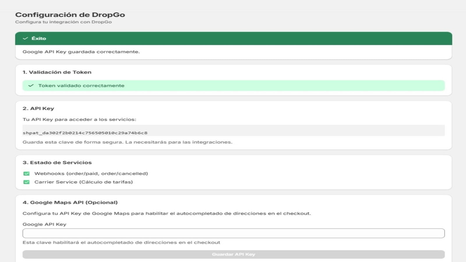 Esta app conecta tu tienda con tu operación logística en el instante. Configura por defecto los webhooks Order Paid y Order Cancelled para crear o actualizar ordenes en DropGo. Por otro lado, expone un carrier service que devuelve tarifas dinámicas basadas en destino, peso y servicio; e integra Google Places Autocomplete en el checkout para reducir errores de dirección.