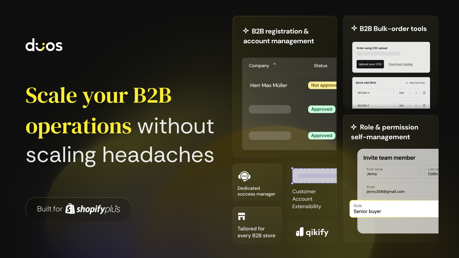Built for B2B-first stores using Shopify B2B primitives, Duos B2B leverages the latest Customer Accounts and brings a self-service experience to B2B clients. It provides a professional workflow for requesting and managing quotes, along with custom pricing, streamlined customer management, and efficient order processing. B2B clients can place bulk orders via SKU entry or CSV upload, while manager-approved workflows help prevent fraud. It's ideal for expanding DTC brands, dedicated B2B stores.