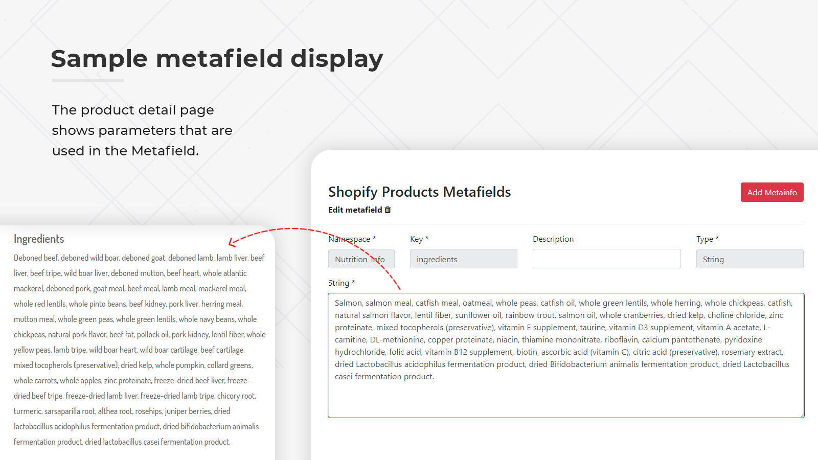 Easily create and display Custom fields, or Metafields content on your product pages.
