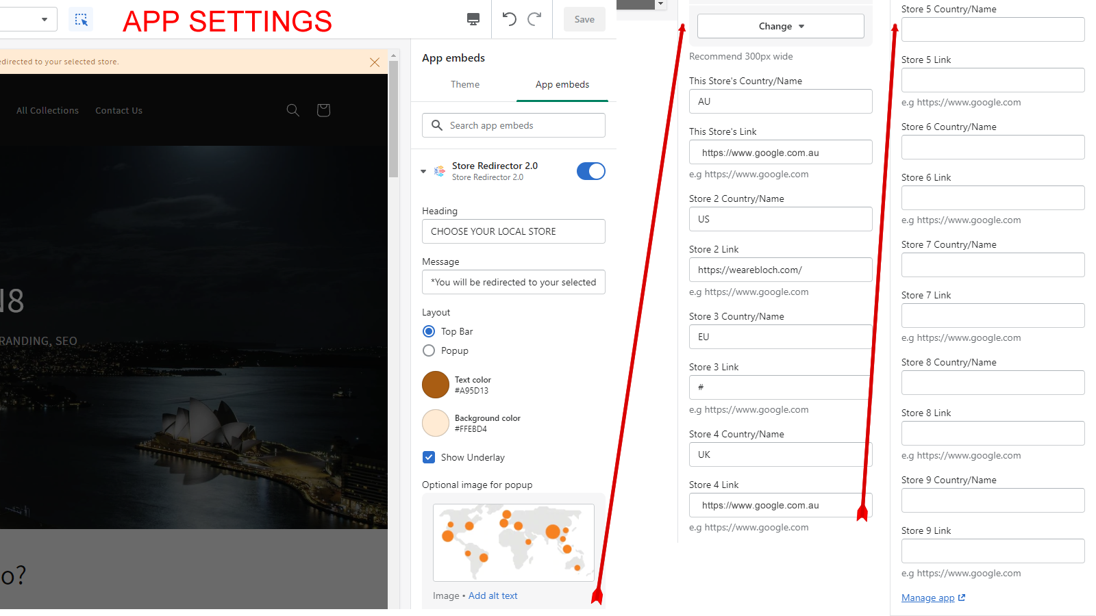 #Why Use This Redirector? - Do you have multiple stores for each country? - Do you have multiple related store for your business? - This app will install into all themes without any coding or script placements. - It will allow you to add upto 9 different links to redirect to. - These links could be to other stores or to special sections in your site e.g Sale page or special promotions page. - Colors can be customised directly in the theme customizer so you can see a live preview.