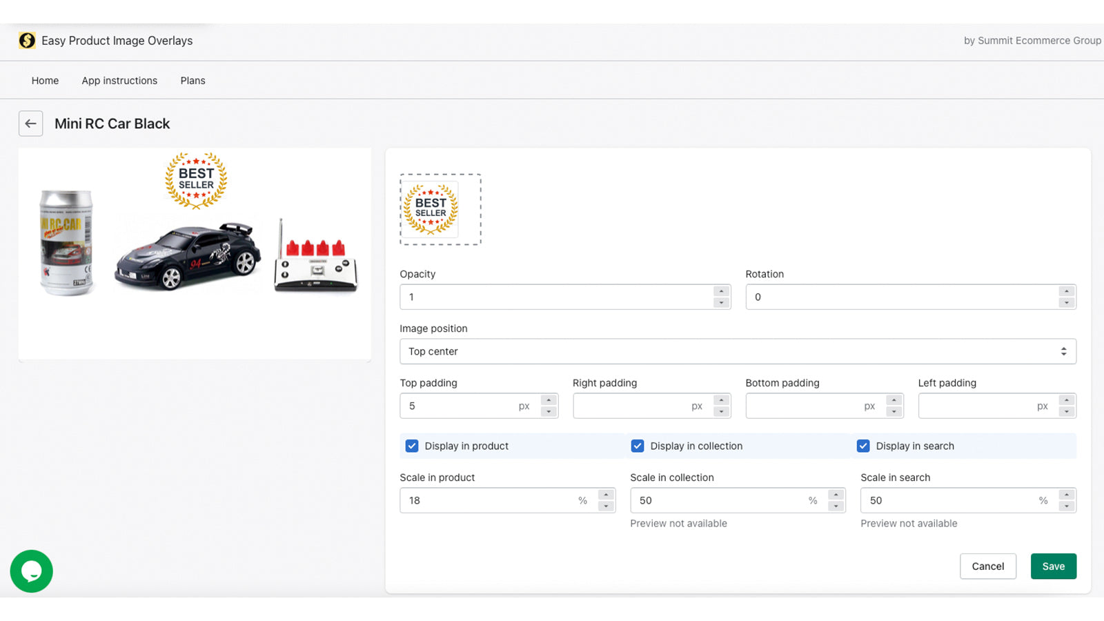 Easy Overlays allows you to quickly add image and text overlays to your product images.