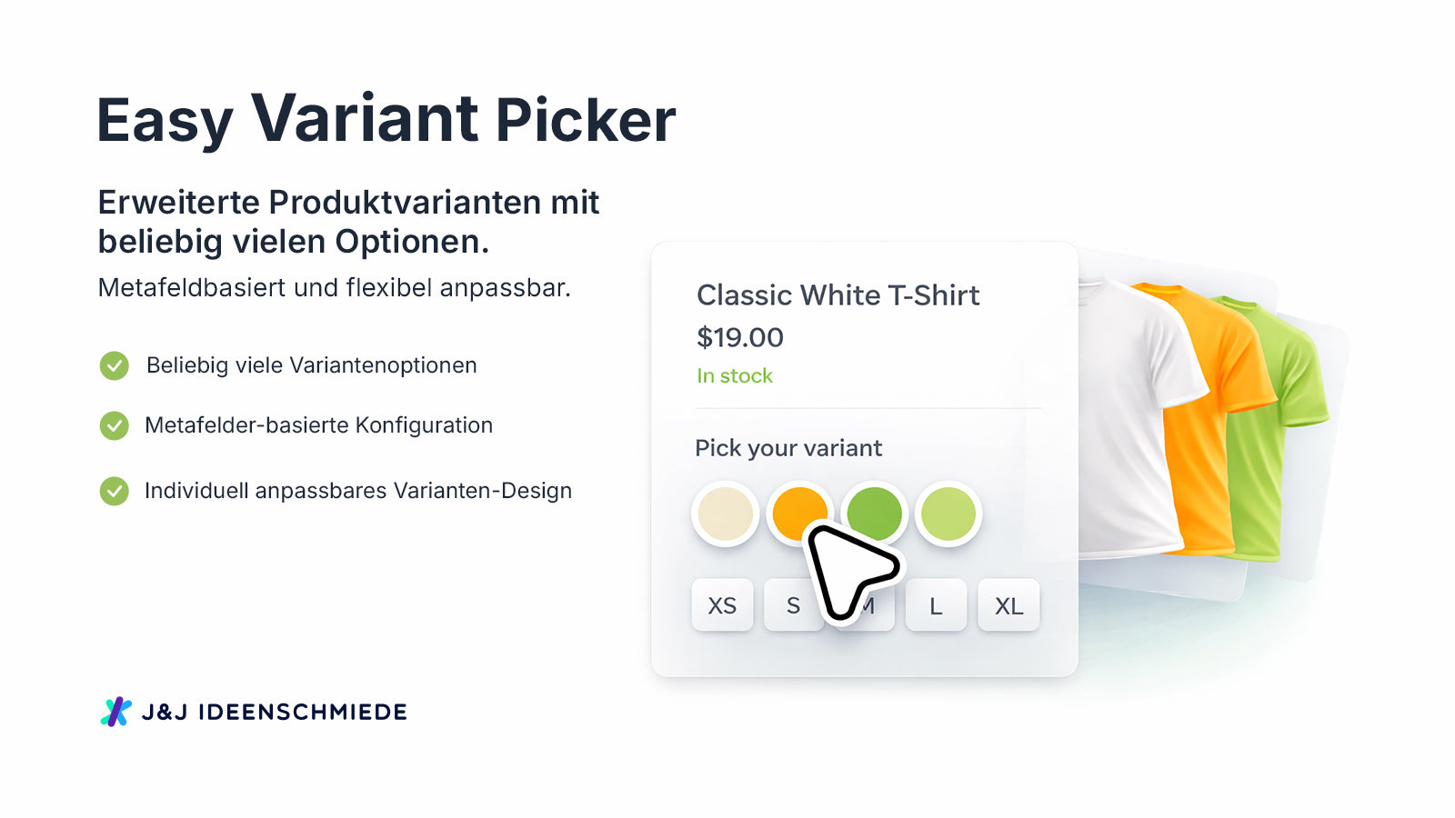 Easy Variant Picker erweitert die Produktvarianten-Funktionalität deines Shops durch metafeldbasierte Auswahlfelder. Die App ermöglicht die Verwaltung beliebig vieler Varianten-Optionen wie Farbe, Material, Größe oder individuelle Eigenschaften. Kunden wechseln zwischen Produktvarianten ohne Seitenneuladung, was die Benutzererfahrung verbessert. Die Integration erfolgt als Theme Extension direkt in dein bestehendes Theme. Du passt Farben, Schriftgrößen und Abstände an dein Shop-Design an.