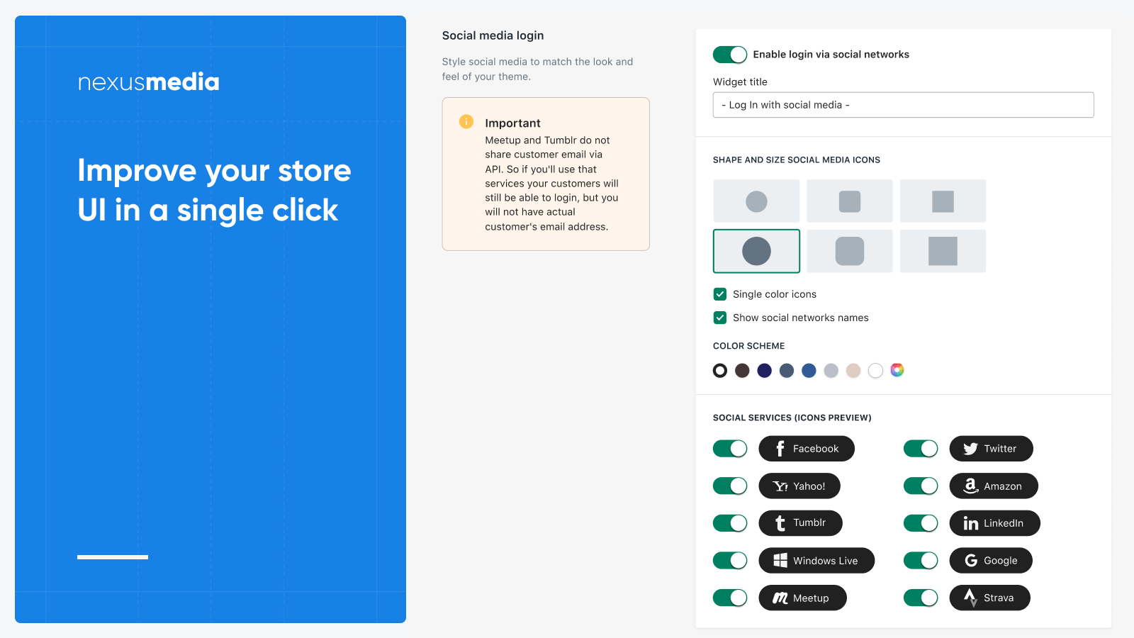 Enhance the store's sign-up rate by empowering customers to sign up and log in using social services or SMS. EasyAuth supports 10 popular social networks: Facebook, Twitter, Google, Yahoo, Amazon, Tumblr, LinkedIn, Windows Live, Meetup, and Strava. OTP Login - lets customers Sign up and Login with phone using an OTP password. Simple, effective, and trusted auth method for any store. The app’s extensive settings let you customize the social media login button's styles to suit your store design.
