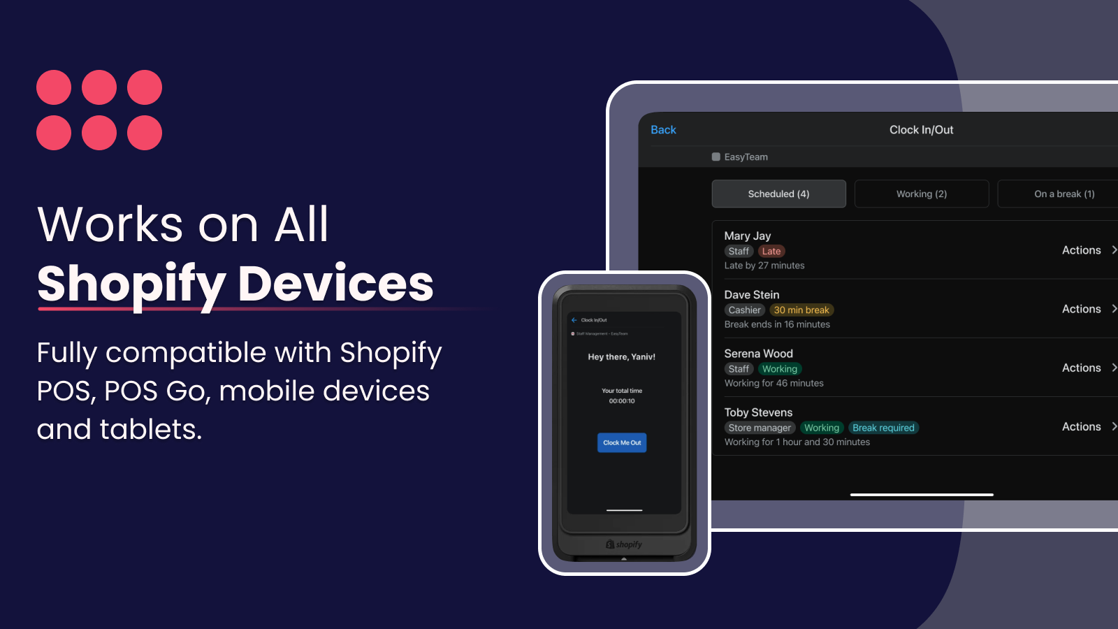 EasyTeam is a staff management platform designed specifically for Shopify Point of Sale (POS) retailers. Join thousands of retailers managing their employees' schedules, timesheets, breaks, payroll, checklists, and sales commissions. EasyTeam stays updated with Shopify's platform and offers a fast & reliable time clock that maintains the UX of Shopify POS. Serving as the homebase of employee management, EasyTeam supports all POS devices (Including Go) and provides top-notch onboarding & support.