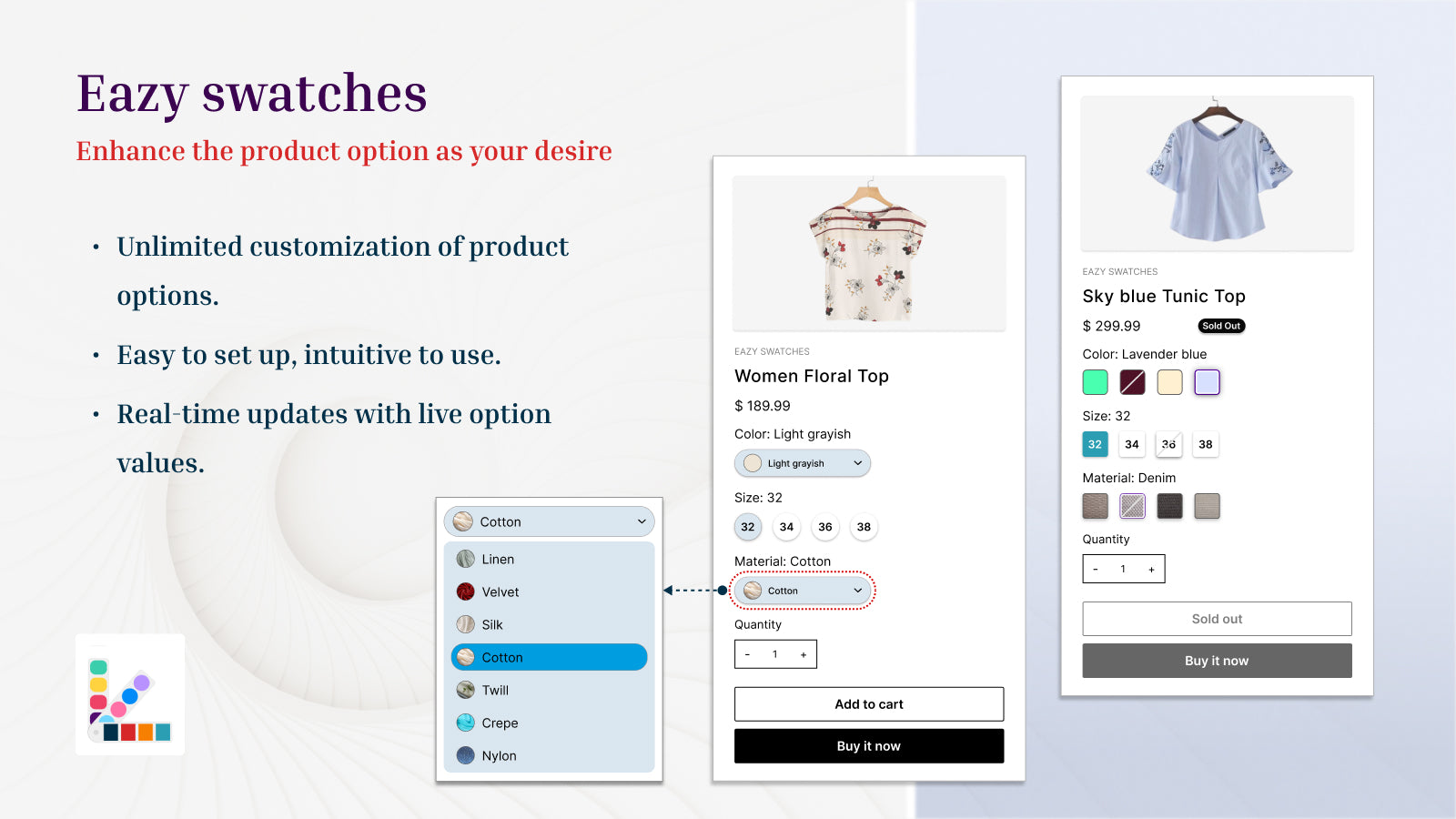 Display product options using customizable image swatches, color swatches, drop-downs, or buttons.