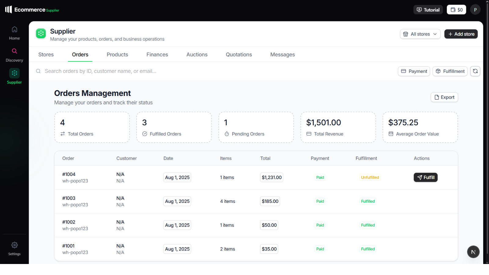 Designed by e-commerce experts, Ecommerce is a comprehensive supplier sourcing platform that connects you with verified suppliers, streamlined order management, competitive auctions, and intelligent product discovery. Build or scale your e-commerce business with access to global suppliers, automated quotation systems, and seamless Shopify integration. No more endless supplier hunting or communication headaches. Enjoy transparent pricing through competitive auctions, 24/7 supplier network access.