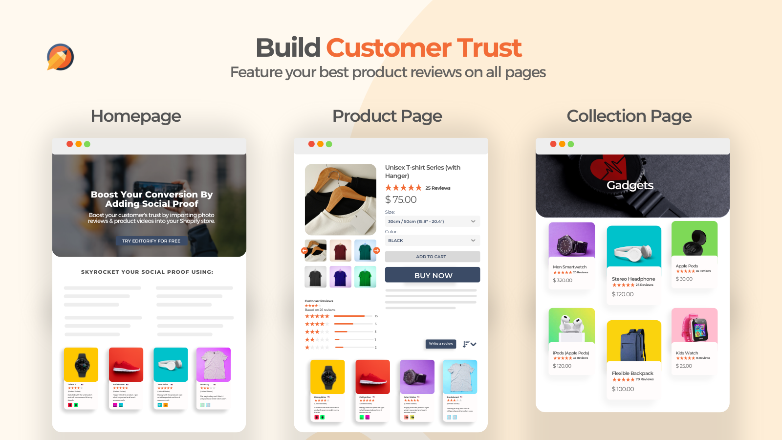 Editorify enhances your store by importing customer reviews with photos and videos from top dropshippsites like Aliexpress, Amazon, Etsy, Temu and more. Customize reviews to fit your store's style, ensuring a seamless user experience on all devices. Our moderation tools allow filtering of content and manual review approval, ensuring quality feedback. Designed for performance, Editorify doesn't compromise your site's speed, offering a robust solution for building customer trust and boost sales.