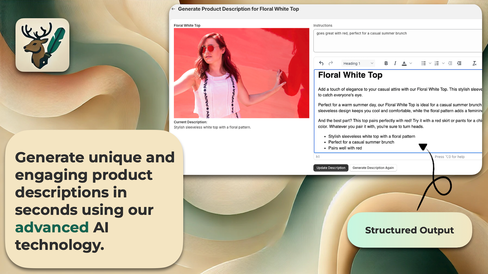 Elk Description Generator empowers merchants to effortlessly create tailored product descriptions that captivate customers and enhance sales. With our latest AI technology, the app ensures consistent and engaging content for your products. Easily integrate with your store and enjoy seamless updates for your product listings. Whether you're launching new items or refreshing existing ones, Elk Description Generator saves you time and effort while maximizing your store's potential.