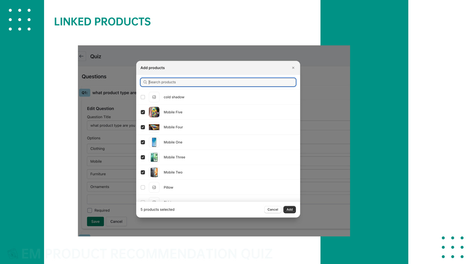 EM Product Recommendation Quiz, the ultimate product recommendation solution for your eCommerce store! With the Quiz app, transform your customer's shopping experience into an engaging adventure. Our interactive quiz feature allows customers to answer insightful questions tailored to their preferences, leading them to personalized product recommendations. Say goodbye to generic product suggestions & hello to a curated shopping journey that delights your customers & boosts conversion rates.