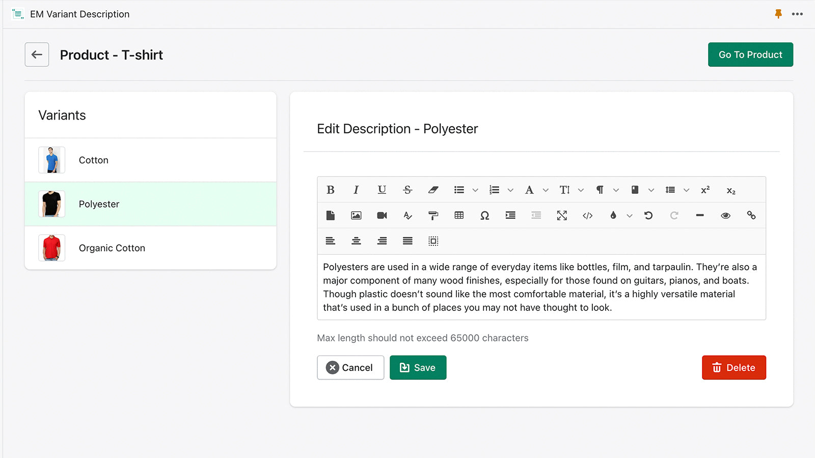 EM Variant Description lets you set unique descriptions for your product variants with the help of a rich text editor and show variant descriptions on the product page. Explain your product features by displaying each variant's size chart, weight, features, type, etc. separately along with the variants for a better understanding. We have the capability to set up a maximum of 5 images for each variant. Note: Our customer support is available from 9 am to 6 pm IST, Monday to Friday.