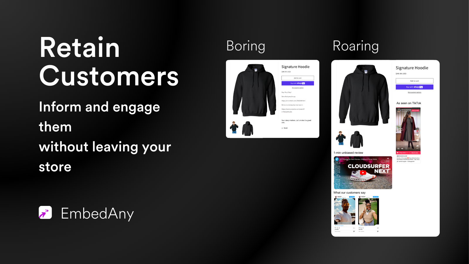 Content is King, but you’re so limited to text, whether it’s in your product description or pages. It’s a pain to add engaging content to your store. Well, until now. EmbedAny lets you embed content, anywhere in your store. By just pasting a link to the content. Almost any content imaginable. Instagram, TikTok, Calendly, video, you name it. We support 800+ of them. Just give the link and we turn them live, interactive and engaging. Within your store. No config - no developers - just a link.