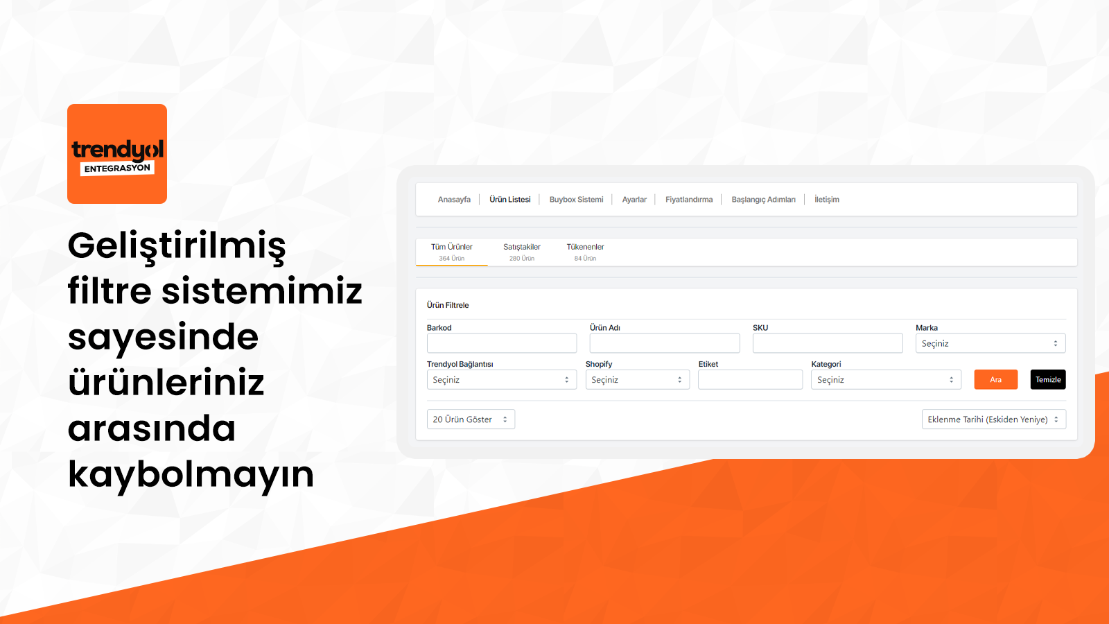 Entafix: Trendyol Entegrasyon sayesinde Trendyol ve Shopify mağazalarınız arasında bir bağlantı kurabilir ve stok & fiyat yönetiminizi oldukça kolay bir şekilde gerçekleştirebilirsiniz. Uygulamamızın arayüzü sizi karışıklıktan uzak tutmayı ve işlemlerinizi rahat ve hızlı bir şekilde gerçekleştirebilmenizi hedeflemektedir. Uygulamamız kendi ürünlerinize ek olarak Trendyoldaki Buybox ürünlerinizi de kolayca yönetebilmenizi ve bir stok kaybı yaşamamanızı sağlar. Bunlara ek olarak 7/24 yanınızdayız!
