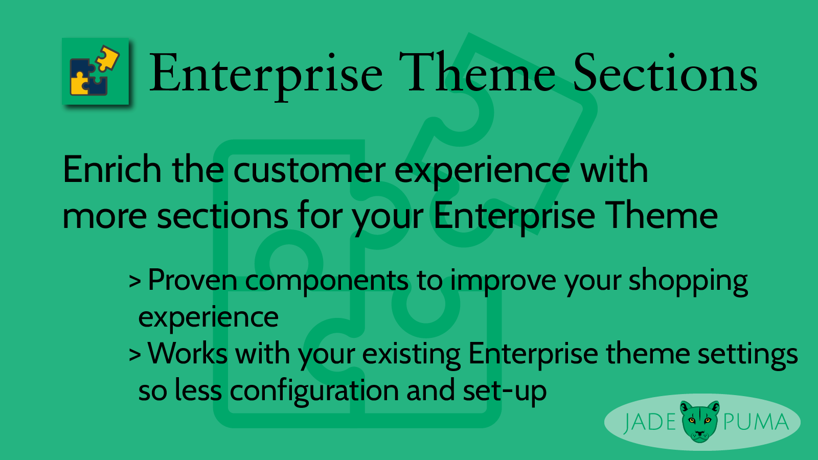 The Enterprise theme is a robust theme with many sections. But if you don't like those sections or need something extra you are stuck with hard-to-learn page-builder apps or expensive developers. JadePuma is solving that issue with a section library full of plug-an-play customizable sections, that you can simply add to the Enterprise on your store and customize in the theme editor. All the sections are designed to work with the theme's existing CSS and Javascript, so your site stays efficient.