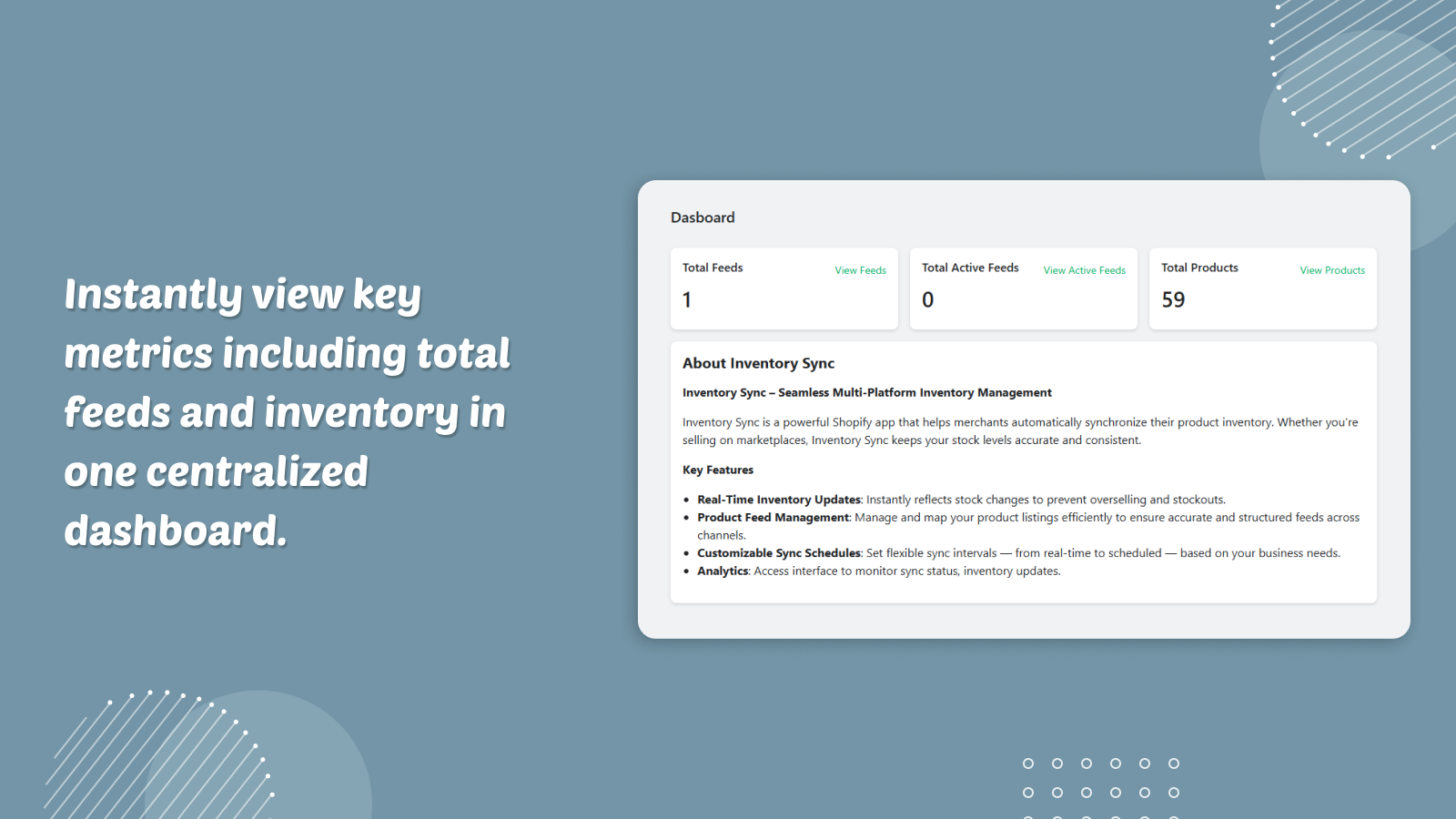 Inventory Sync enables seamless and automatic inventory management for merchants. It keeps product feeds and stock levels, helping to prevent overselling, stockouts, or mismatches. With real-time synchronization, you can ensure accurate inventory data, streamline operations, and improve customer satisfaction by always having the products available when needed.