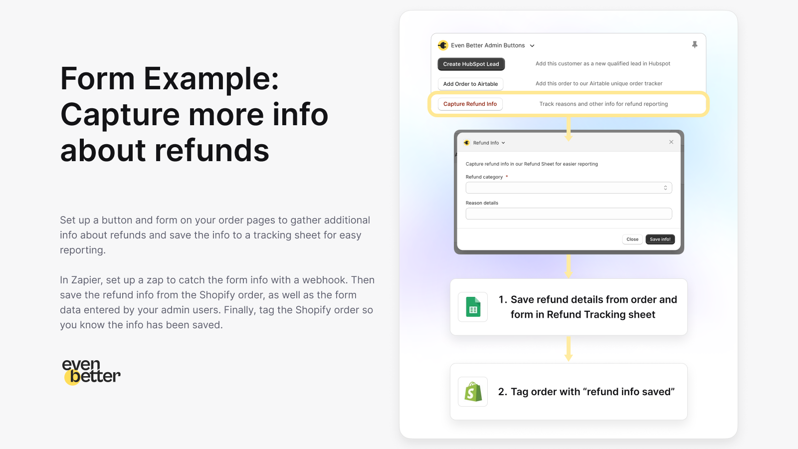 Soup up Shopify Admin to save time completing repetitive store management tasks. Add mini-apps with buttons and forms right to your admin pages, to trigger multi-step tasks in automation apps like Zapier. Working right in the context of Shopify admin saves time and reduces errors for your team. Add buttons and forms to: orders, draft orders, abandoned checkouts, products, variants, collections and customers. Trigger automations (via webhooks) in Zapier, Relay.app or your own back-end.