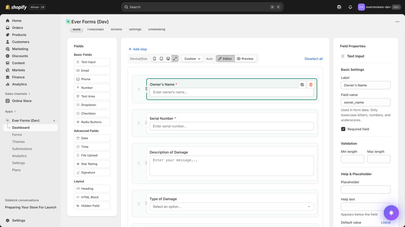 EverForms lets merchants create custom forms to collect structured information from customers directly on their store. Forms can be added to pages, products, or other customer touchpoints to capture enquiries, requests, and additional details at the time they are needed. All form responses are stored within the merchant’s own store data rather than on external systems. This allows merchants to retain ownership of their information and access submissions alongside their existing store records.