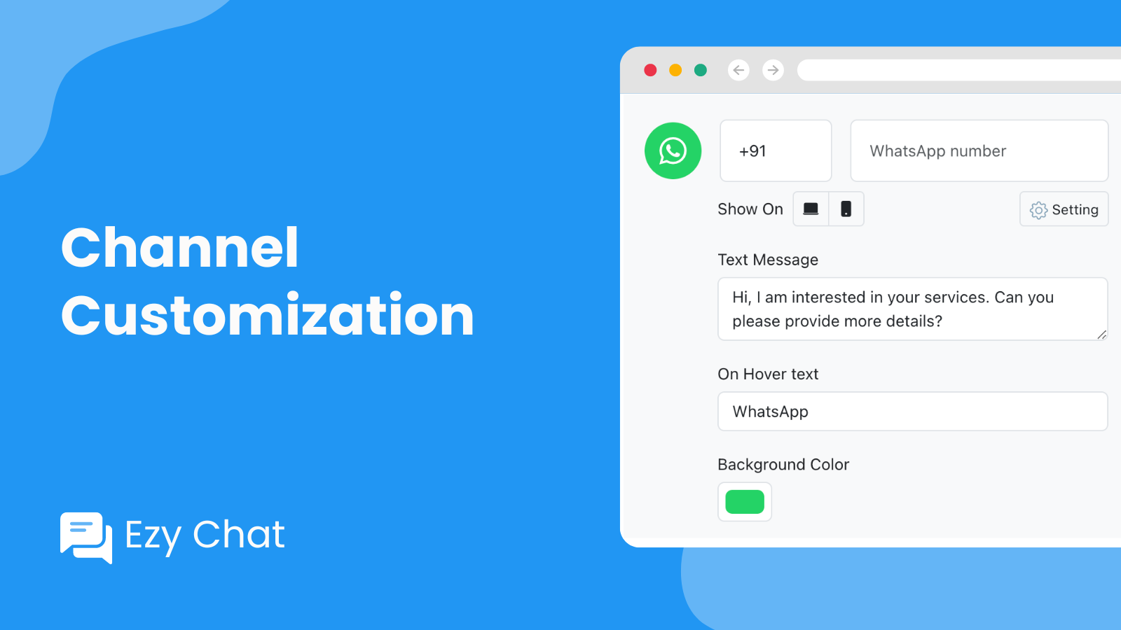 Ezy Chat is your all-in-one solution for customer communication, allowing them to chat with you via WhatsApp, Facebook Messenger, SMS, email, phone, Instagram, TikTok, Telegram, and more. Enhance accessibility with phone buttons, Call Now options, and click-to-call widgets.Increase sales conversions, generate leads, and improve client support with Ezy Chat versatile live chat button.