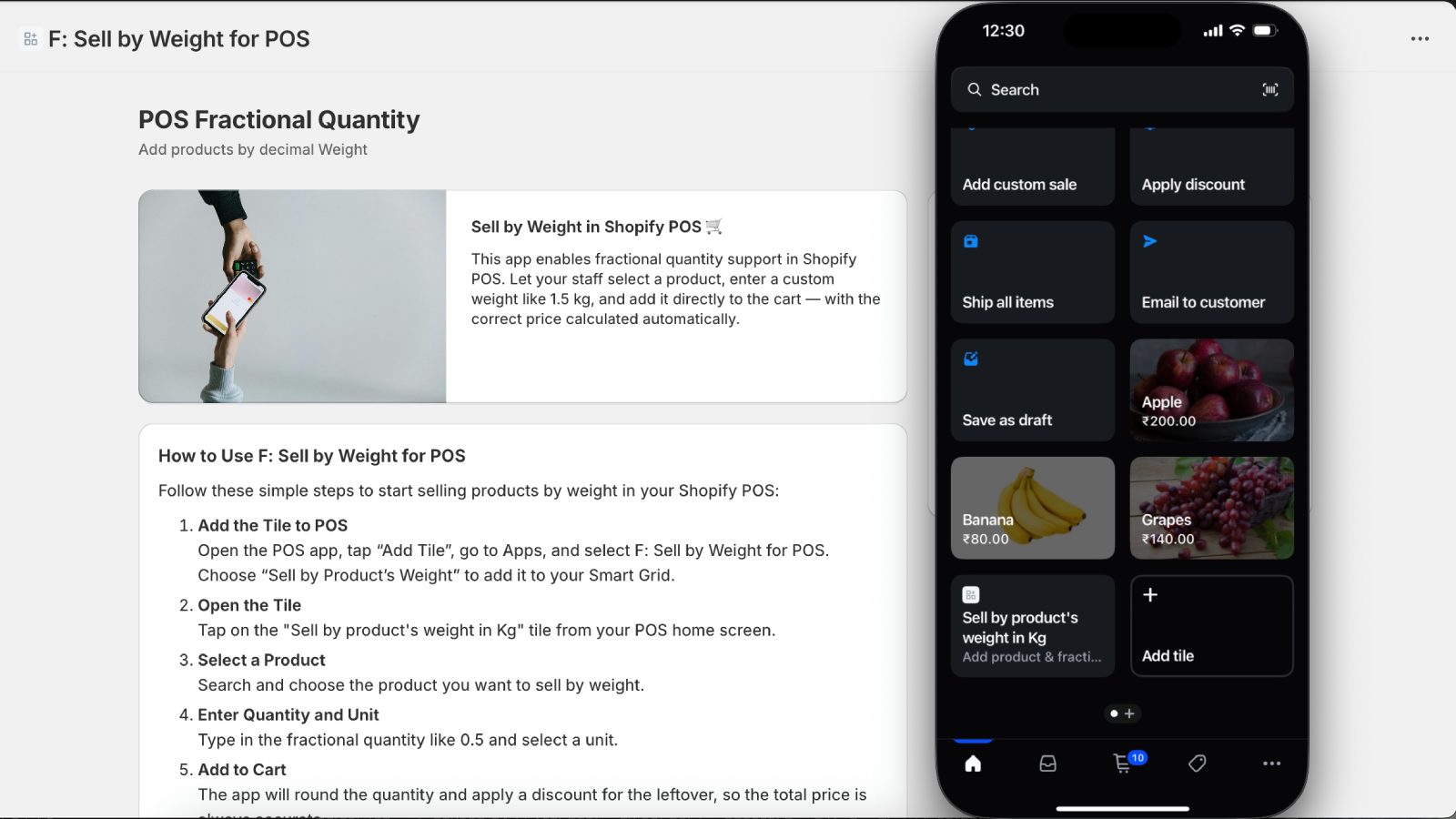 Our app lets merchants sell by weight via Shopify POS. Customers enter fractional quantities (e.g. 0.5 kg) seamlessly added into cart. Perfect for grocery shops, fabric stores, delis, zero‑waste refill outlets, butcheries, hardware shops any business selling measured goods efficiently