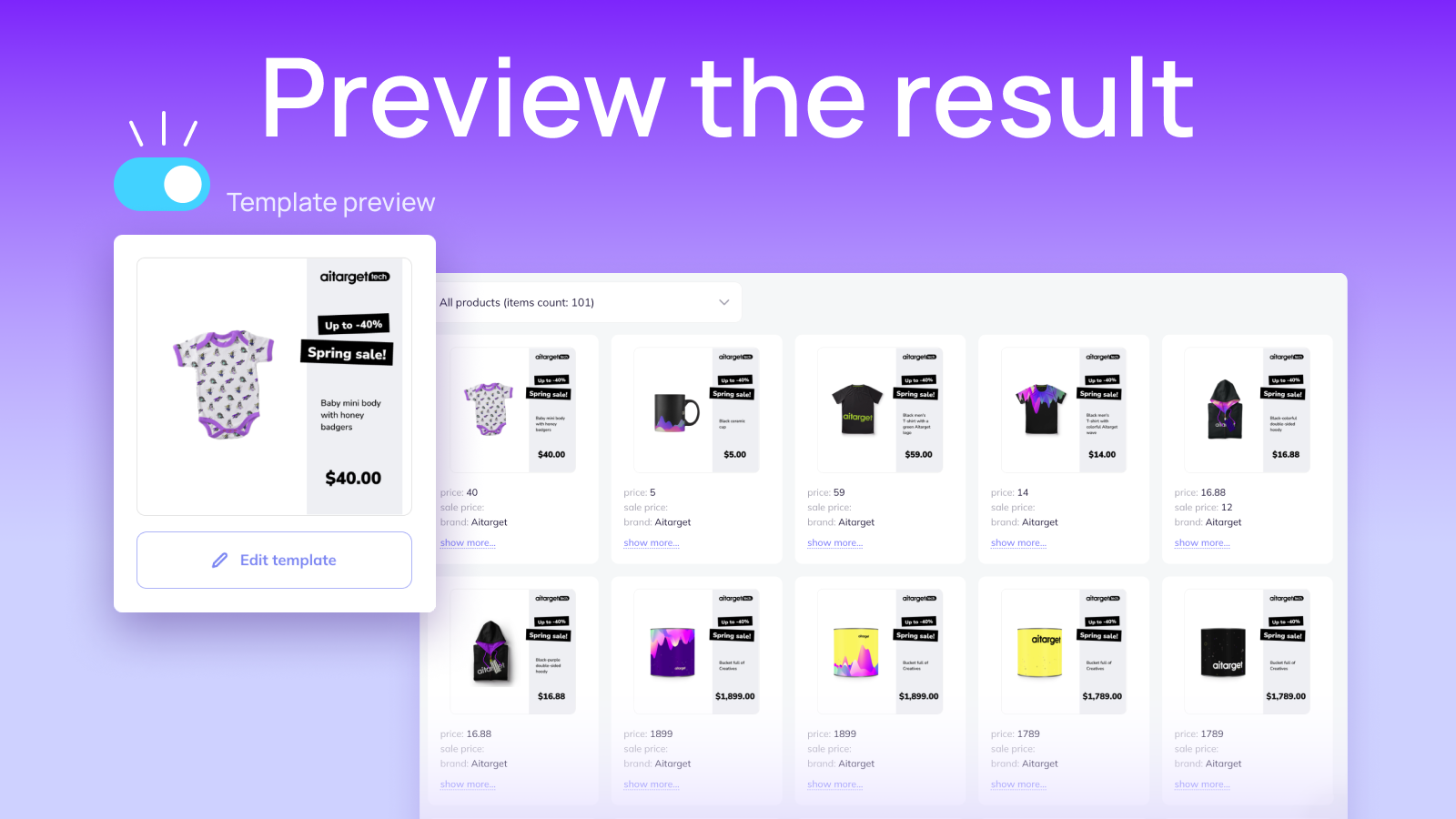 Create beautiful overlay templates for dynamic product ads (DPA). Apply the visuals to the whole product feed and use it for ads immediately. [1] Fine-tune banners with your brand colors and elements. [2] Add price, discount, and additional info to all products in one click. [3] Improve the results of your Facebook & Instagram dynamic prospecting / retargeting ads.