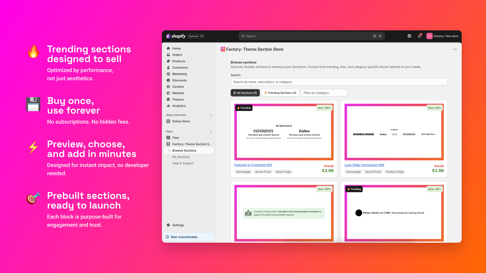 Factory: Theme Section Store offers theme sections that merchants can instantly add to their store.