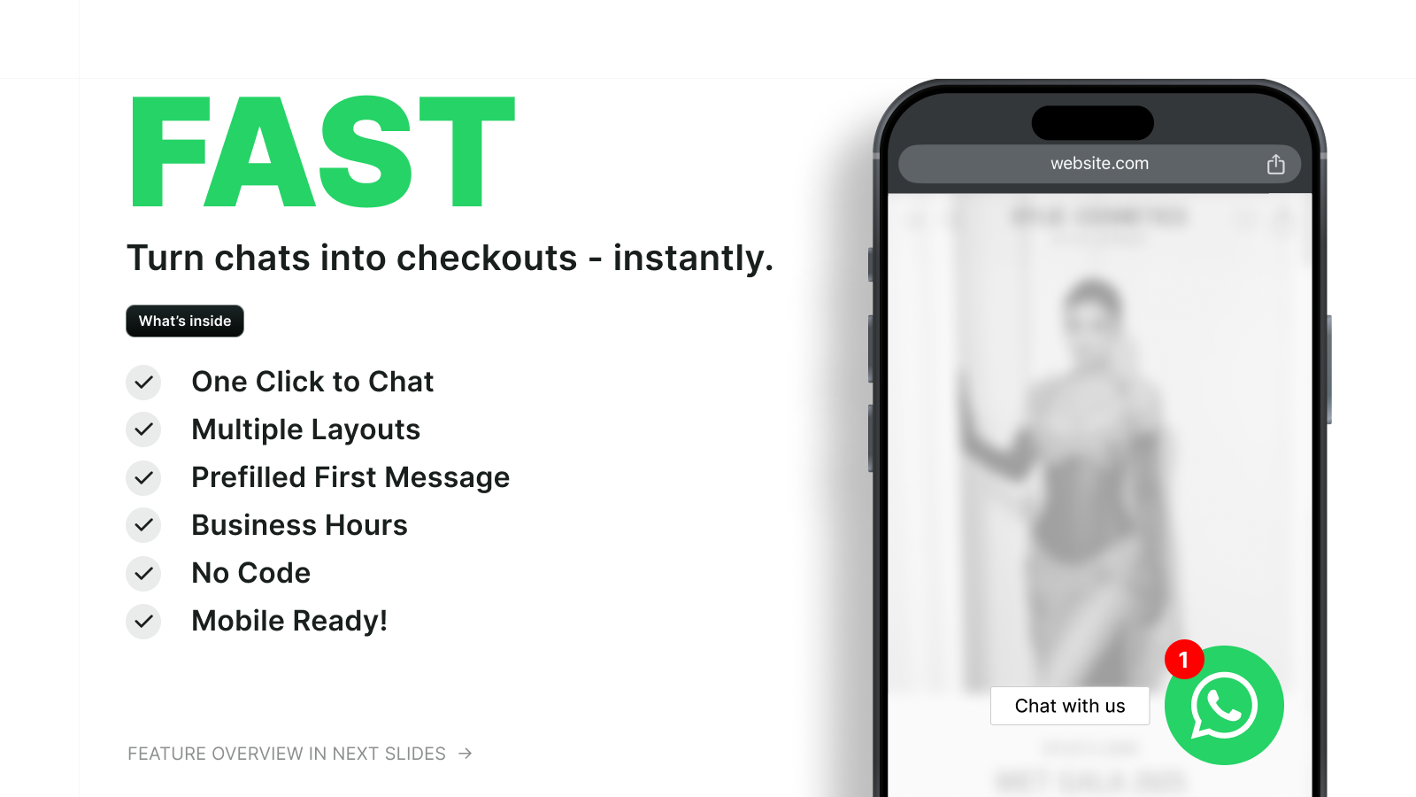 From “Hi” to “Buy” - faster. Turn chats into checkouts with a WhatsApp chat button.