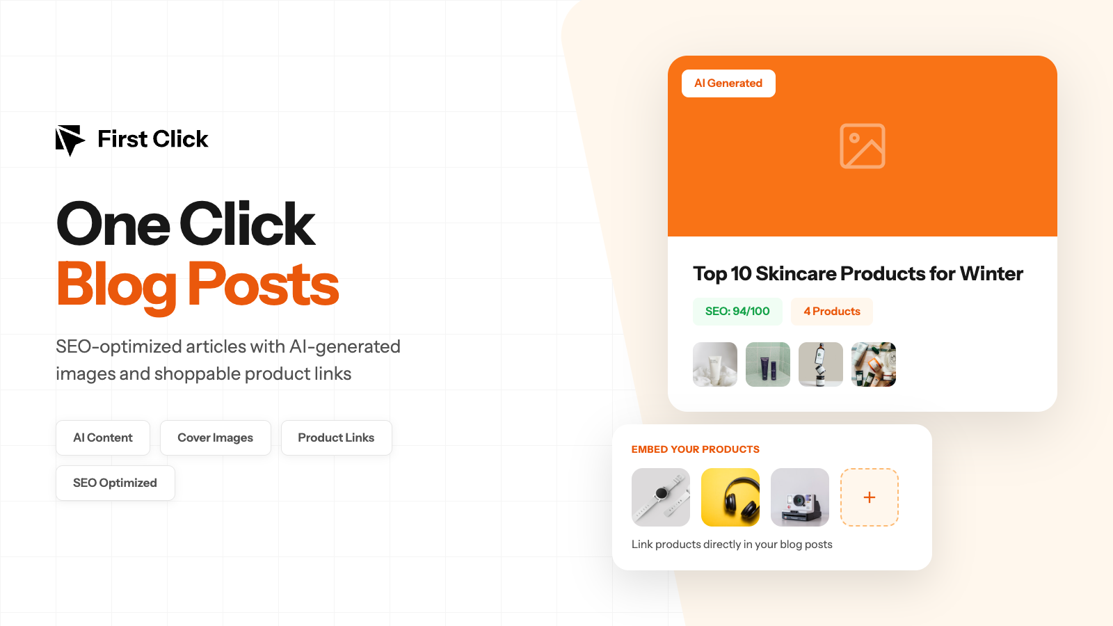 Create SEO-optimized blog content for your store without writing a single word. This app uses AI to generate complete articles with unique cover images and embedded product links that drive sales. Each post is optimized for both traditional search engines and AI-powered search tools, helping customers discover your store. Simply enter a topic or select products to feature, and publish. The app handles content creation, image generation, and SEO + AEO to get mentioned by llms like ChatGPT.