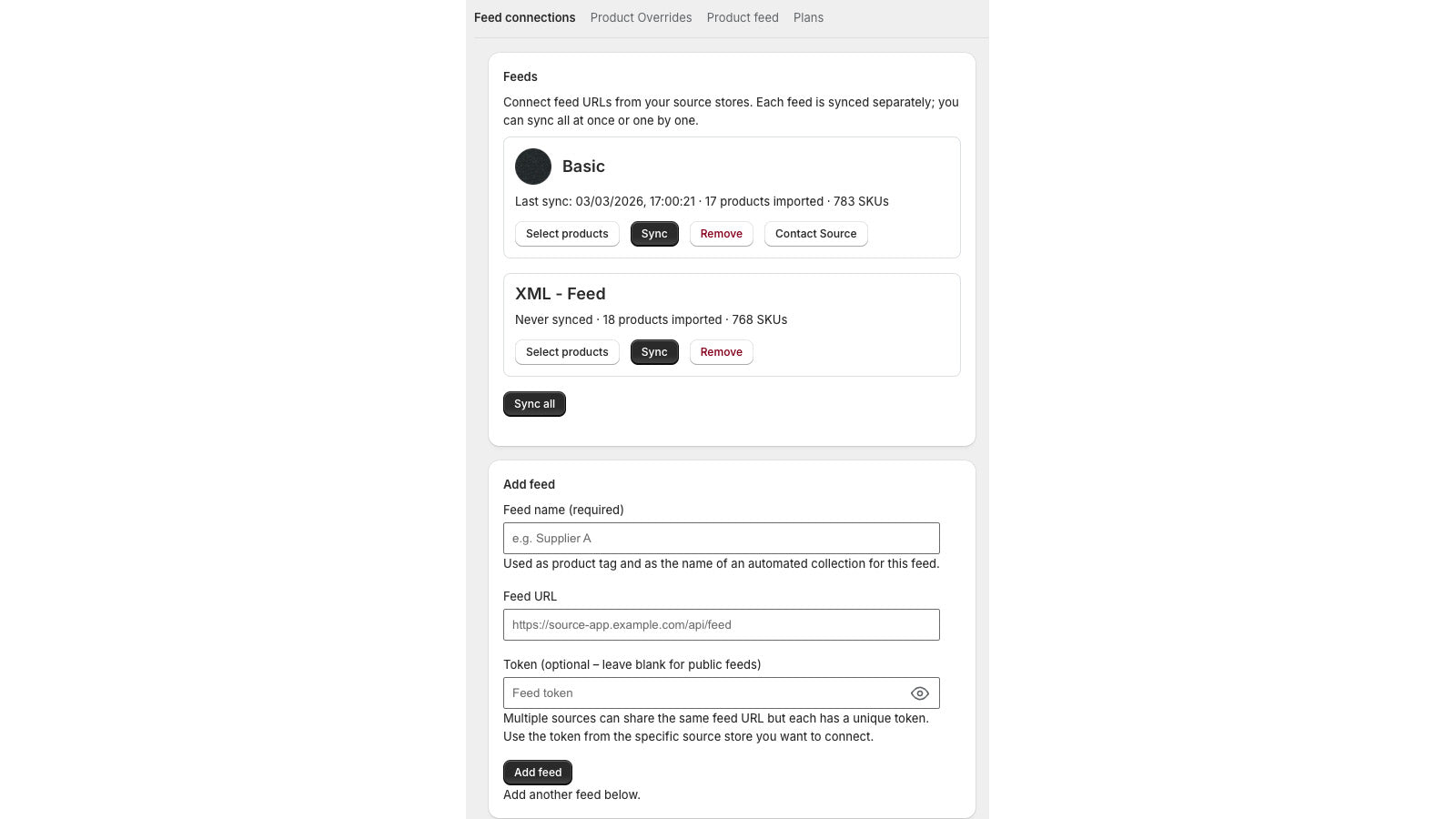 Feed In lets resellers connect their store to supplier product feeds and sync catalogs in one place. Add feed URLs, sync products and variants, and optionally override product details. Manual or scheduled syncs keep your catalog aligned with suppliers. Built for resellers and wholesalers who want to sell supplier products without re-entering data or maintaining spreadsheets. Feed Out and Feed In: the ecosystem for suppliers and resellers to share and sync product catalogs automatically.