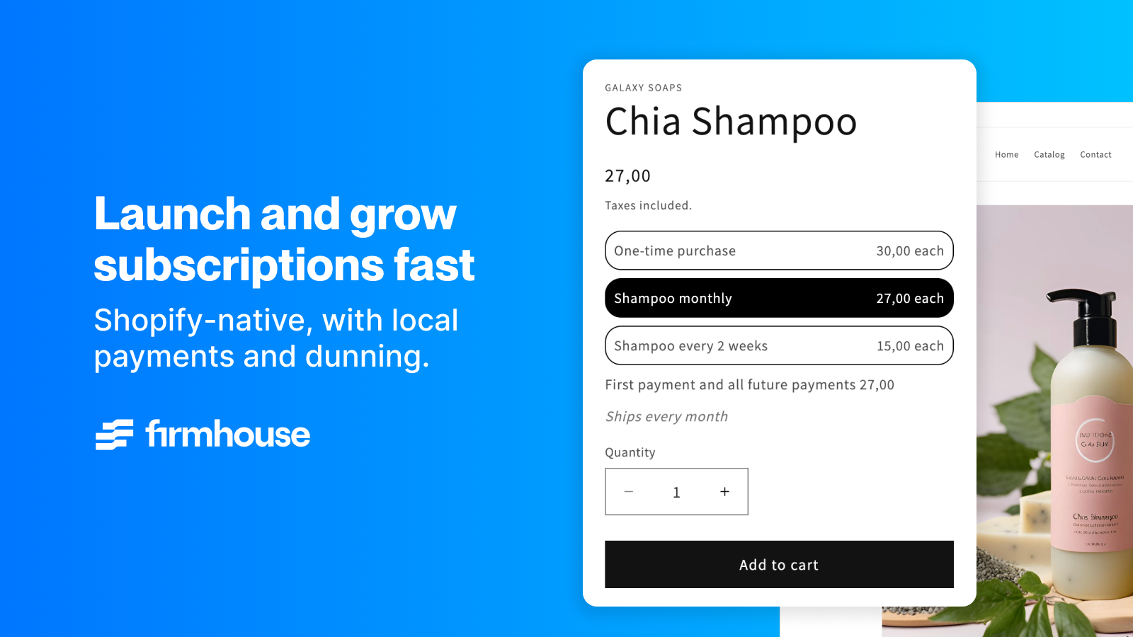 Firmhouse powers subscriptions, prepaid, memberships, rentals and Try & Buy inside Shopify. Give shoppers a clean self-serve subscription experience that increases revenue and strengthens relationships. With localized billing and renewals you are ready to take Europe, using Shopify Payments for cards and Shop Pay, and adding regional methods through other supported PSPs.