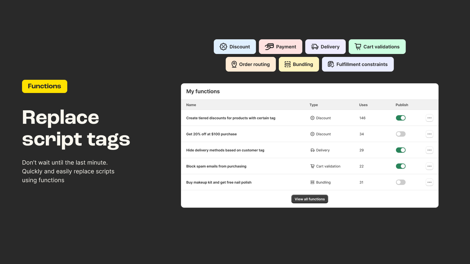 Our newest app - built by Shopify app veterans! Easily migrate from Shopify Scripts! Function Junction helps you migrate old scripts and build advanced Functions for discounts, bundles, payments, delivery, and validation—no coding required. We've built this app for our agency clients and are now releasing it more broadly to support all stores. Shopify Scripts will be deprecated on August 28, 2025, get ahead of that now! Works for all Shopify plans.