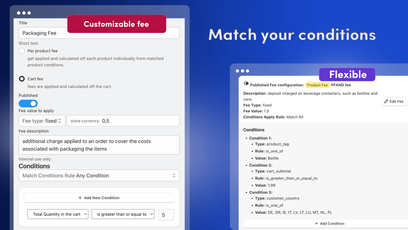 With this app, you can create extra mandatory fees and apply them when customer add or change products in their basket. Attach fixed-amount or percentage-based fees to specific products or the entire shopping cart. Define conditions to control the fee applicability. The fee will be added by the app via webhook in the background and when detected the cart will be updated in the storefront. Enhance store’s flexibility with our app by adding product fees, cart or category fee