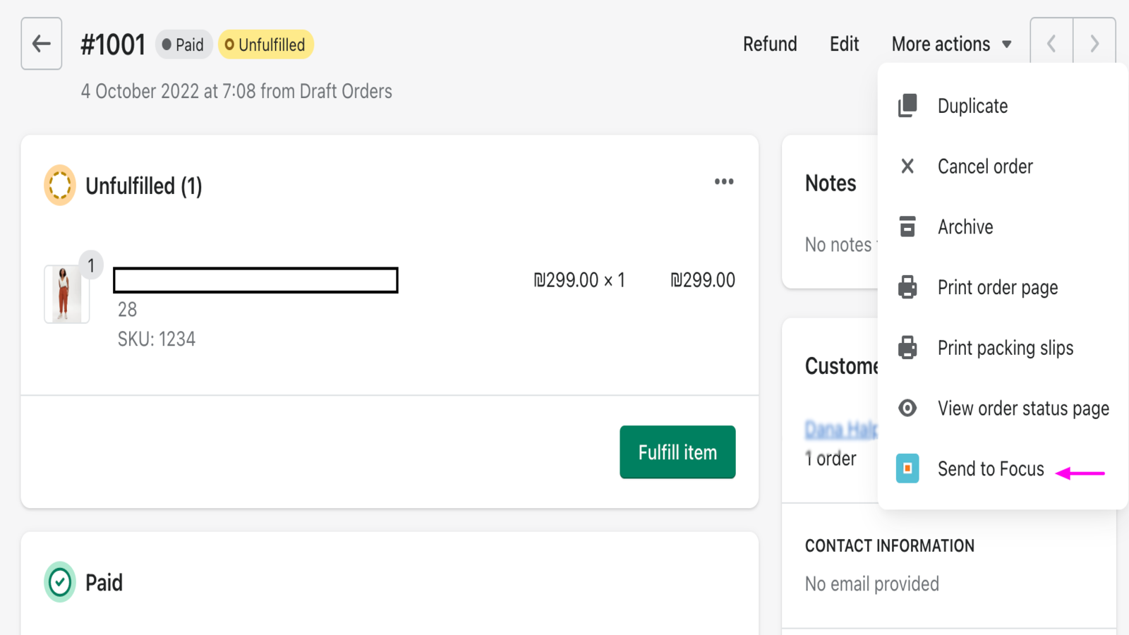 1. Order sync – Integrating your Shopify website with Focus shipments allows you to sync all the orders from your Shopify store with your Focus account. 2. Automatic data input: No need to manually type the order information and shipping addresses. A new shipment is created with all the needed information with one click. 3. Shipping labels: Print shipping labels straight from Shopify with one click. 4. Order updates: Mark the order as fulfilled and update the tracking information.