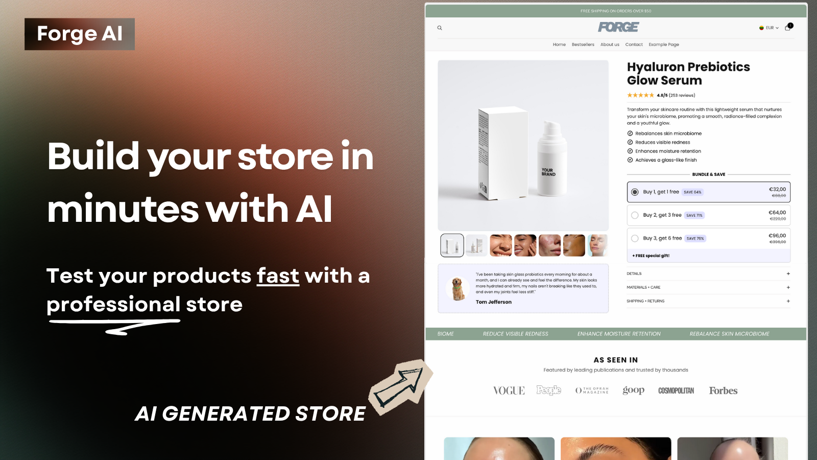 Forge: AI Store Builder is the fastest way to launch a beautiful, conversion-ready AI store. Using advanced AI, Forge designs your theme, writes product copy, and builds complete store templates automatically — no coding or design skills required. Simply choose a product, and our AI builder generates a full Shopify store with a homepage, product pages, and optimized content. Perfect for dropshippers and e-commerce founders who want to test and launch products fast.
