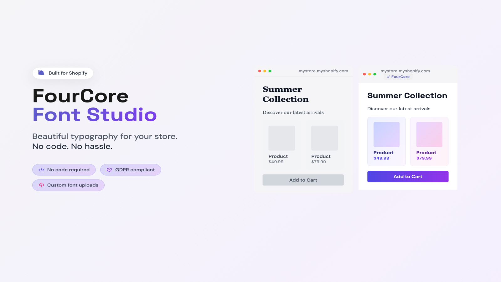 FourCore Font Studio helps merchants manage storefront typography without editing theme code. Merchants can choose Google fonts or upload custom files, then target headings, body text, links, buttons, custom selectors, pages, languages, and device types. Draft and active statuses let teams review changes before publishing. Theme Audit verifies app embed status, and GDPR mode uses local hosted fonts from Shopify Files instead of Google font requests. This keeps daily font updates simple and clear