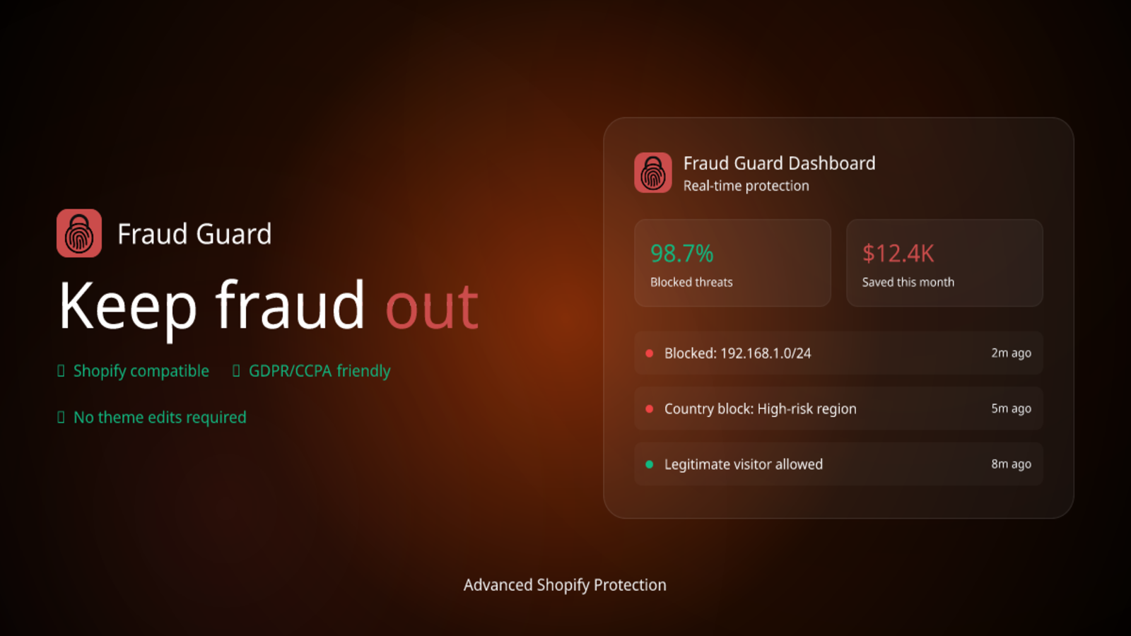 Fraud Guard blocks risky visitors before they interact with your store. Use rule-based controls to stop fraud attempts early and reduce chargebacks. Track blocked traffic and monitor ROI with simple dashboards. Designed for Shopify merchants who want fraud protection without slowing down real customers.