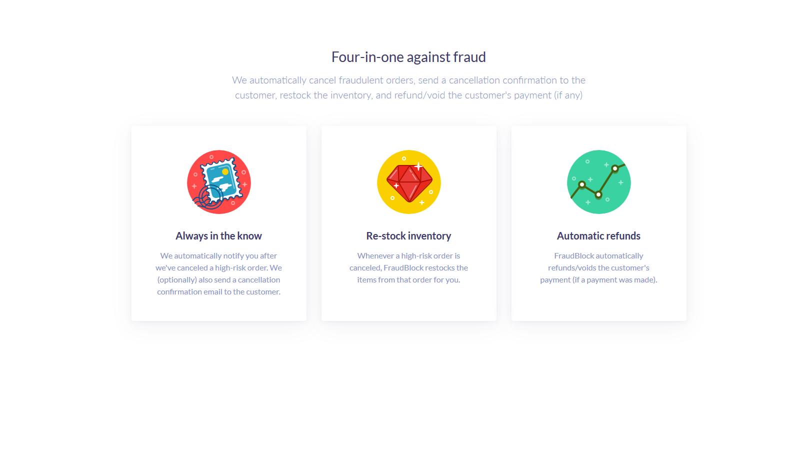 The app automatically cancels 'high-risk' orders, send a cancellation confirmation to the customer (optional), restocks the inventory, and refunds/voids the customer's payment (if any). While Shopify automatically flags high-risk orders for you, it doesn't cancel them - you still have to go through your list of orders manually. Whenever you receive a new order, we check it based on Shopify's fraud analysis - if it's a high risk-order, we automatically cancel/refund, preventing any chargebacks.