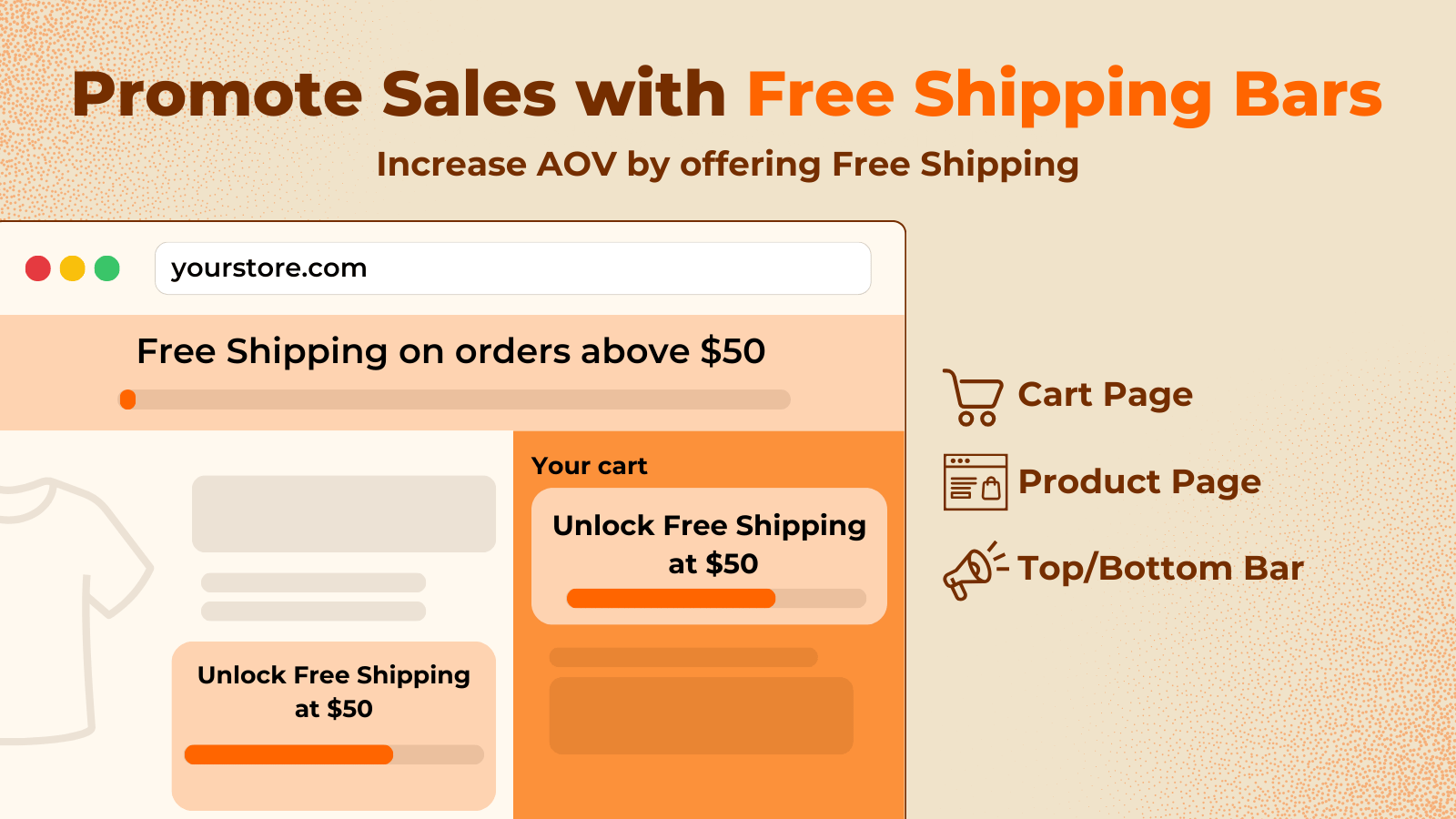 Engage customers and drive sales with a dynamic Free Shipping Bar that motivates shoppers to add more items to their cart. Displays real-time cart value, showing customers exactly how much they need to spend to unlock free shipping—encouraging higher spending and promoting average order value.