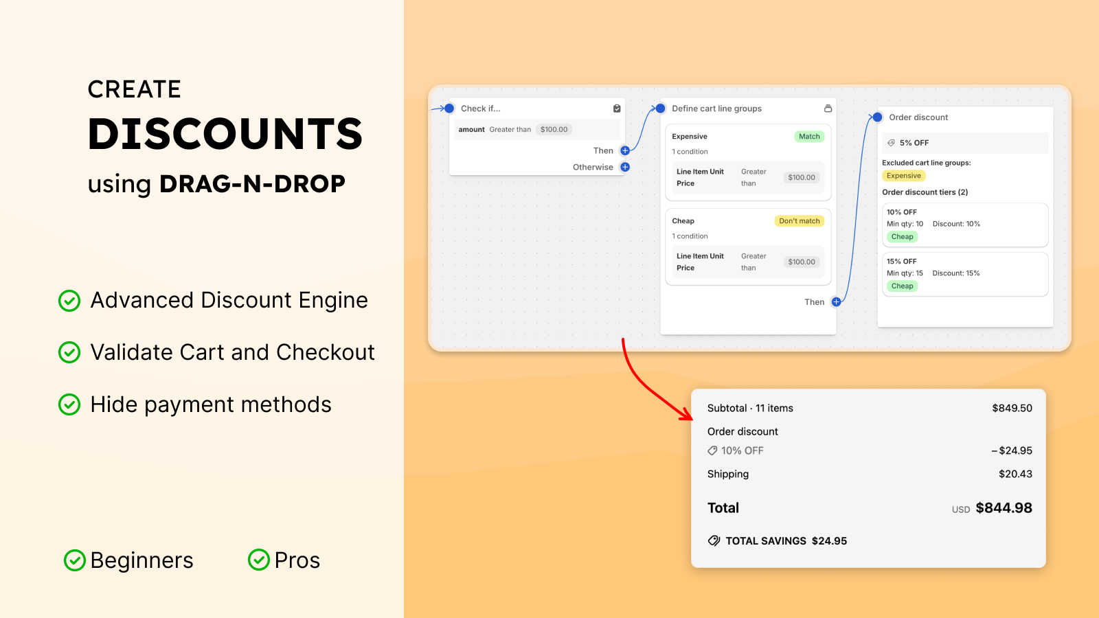 Imagine building powerful discount rules out of the logic blocks. Just drag-and-drop logic blocks to create clear, easy-to-manage flows. Create unified discounts, payment customizations, checkout, and cart validation rules. Migrate from Shopify Scripts to Shopify Functions using Function Studio. Simple to create, simpler to manage.