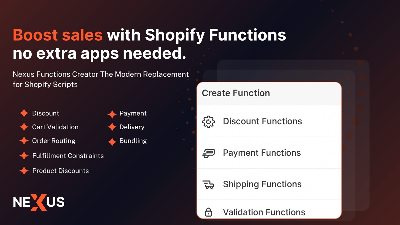 Scripts are being deprecated — Nexus Functions is your modern solution! Are you a Shopify Plus merchant using Script Editor, or looking for advanced checkout customizations? With Nexus Functions, you can easily create powerful Functions for discounts, payments, delivery, and validation — no coding needed. Build Functions manually, use our Script Migrator, choose from smart presets Take full control of your checkout experience — with Nexus Functions.