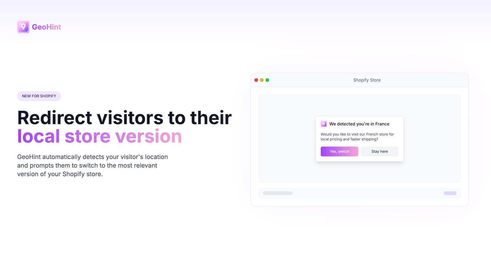 GeoHint auto-detects visitor location and displays popups suggesting a switch to the local store. Improve conversions with localized shopping, reduce cart abandonment with local shipping options. Easy to set up, fully customizable, mobile-optimized, and compatible with all themes.
