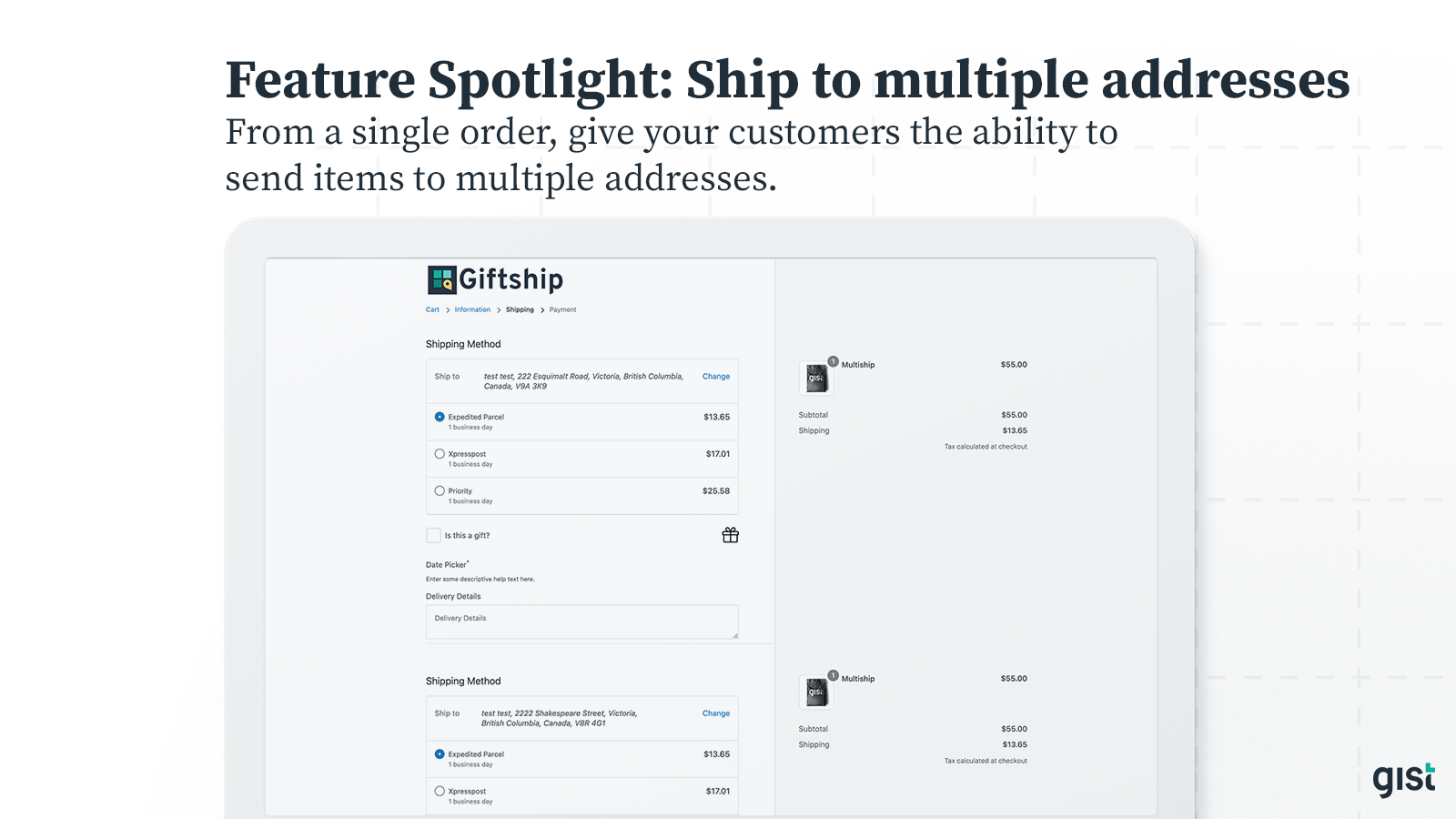 Giftship offers a broad range of gifting features that work harmoniously on your storefront, and during the fulfillment process. Give your customers the ability to send items to different addresses in a single checkout. Collect and automatically print gift messages. Offer a delivery date option and auto-tag your orders. Organize functionality blocks and display logic through product / cart / drawer cart / checkout options. Also included is a premium box builder and a dynamic drawer cart.