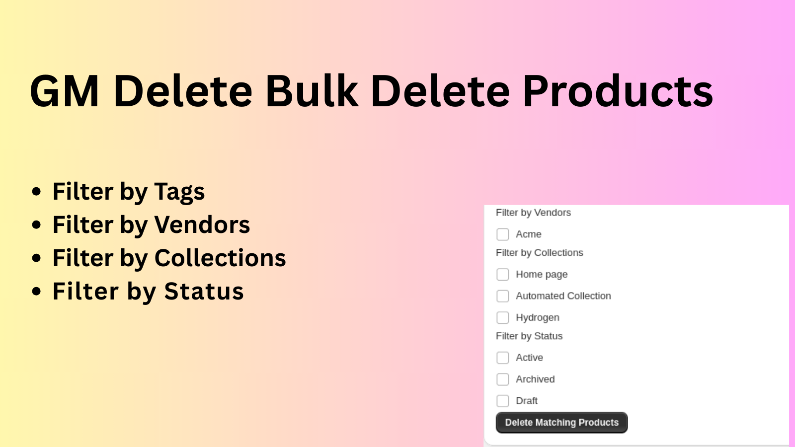 Bulk delete products by filtering with Tags, Vendors, Collections, or Status.