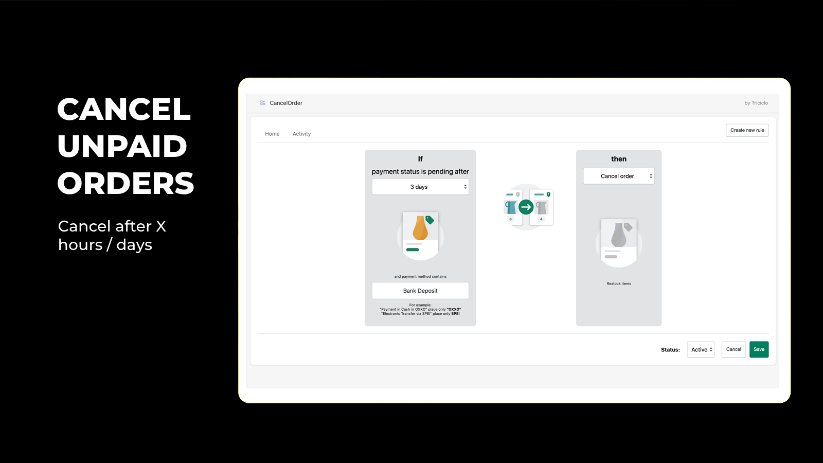 Define your own rules Cancel any pending order based on payment method Unblock the inventory in unpaid orders