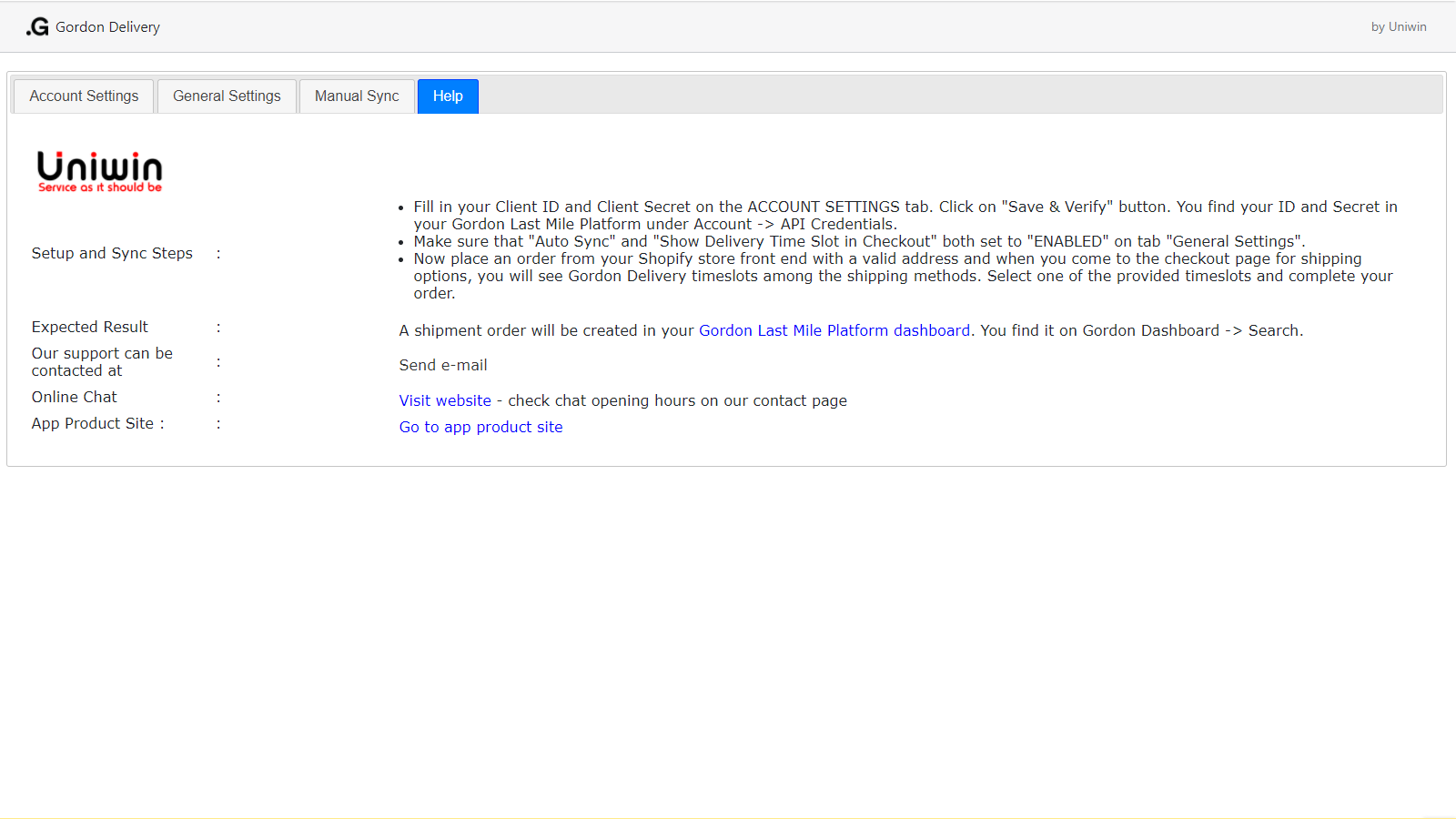 This Gordon Integration is the solution for you if you are using Gordon for delivering your packages and Gordon Last Mile Platform as TA/TMS-system for managing your shipments. This app will show Gordon Delivery timeslots in Shopify’s Checkout. The selected timeslot will be saved with the placed order. NOTE: This "Gordon" app will be replaced by new app with name "Gordon Delivery". You will be contacted for migration after new version is released.