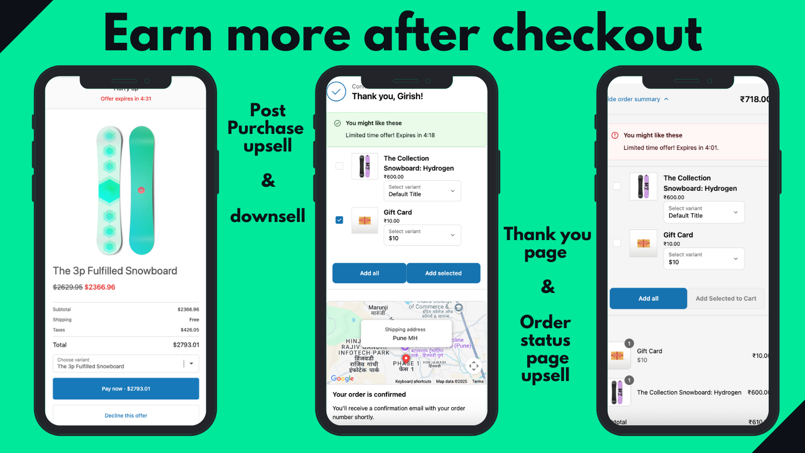 Earn more after checkout with 1 click Post Purchase Upsell, order status page/Thank you page upsell.